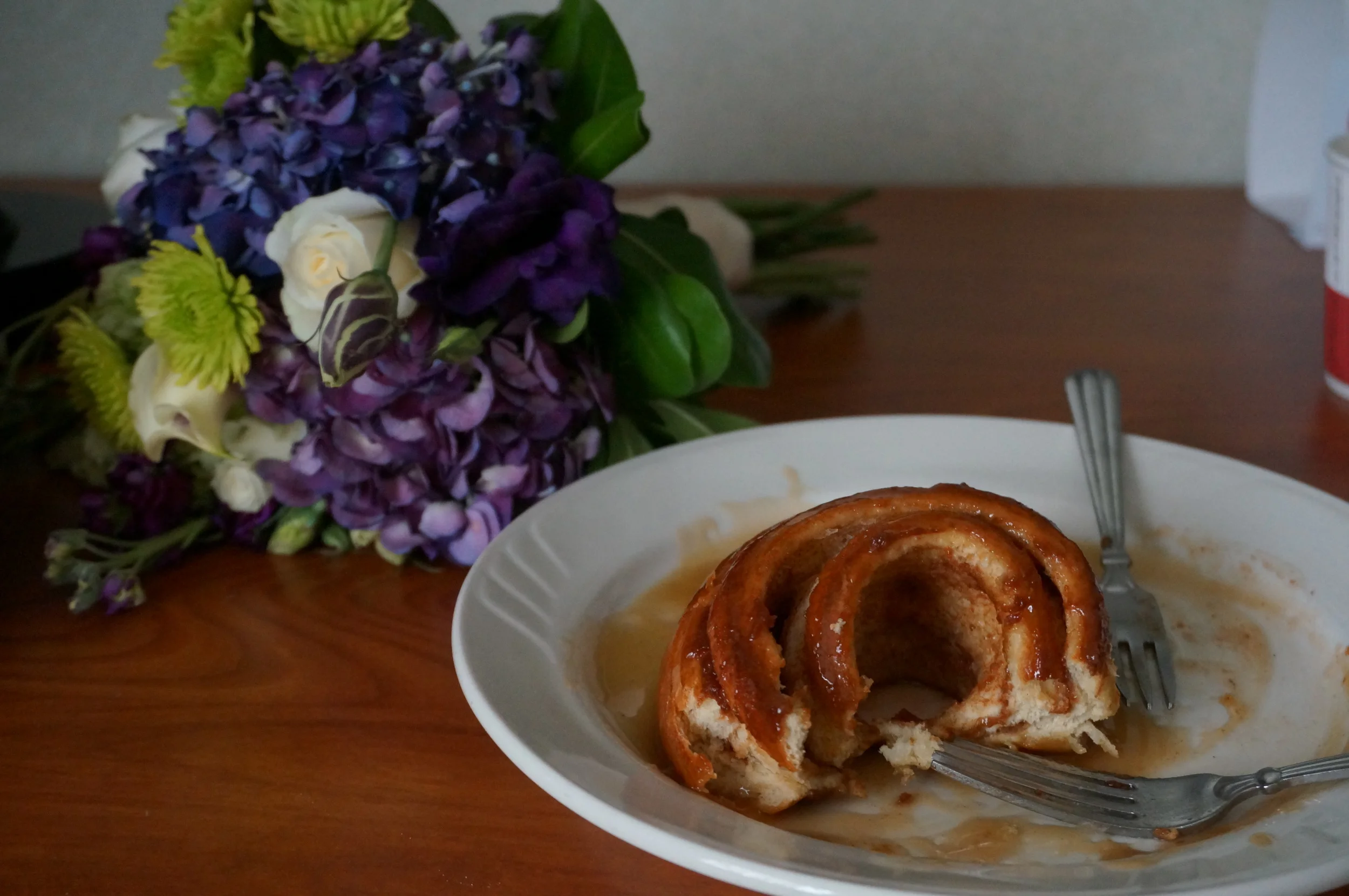 I love this shot so much... it was the highlight of my morning after the wedding. Room service, caramel sticky buns that reminded me of my Grandparent's farm, and a bouquet of stunning flowers.