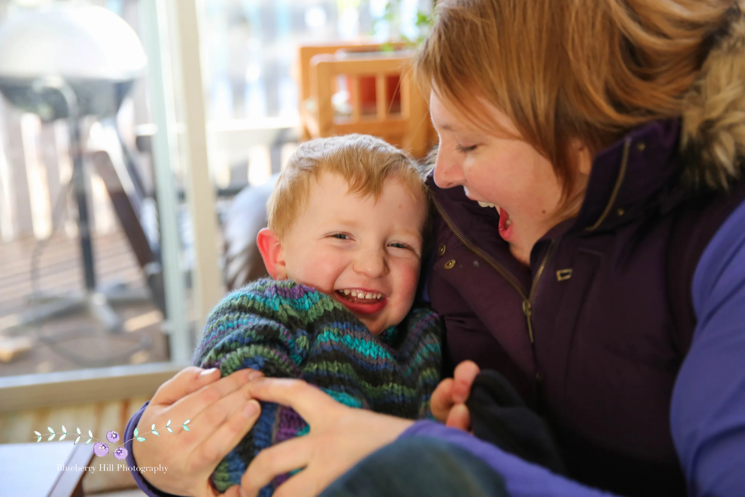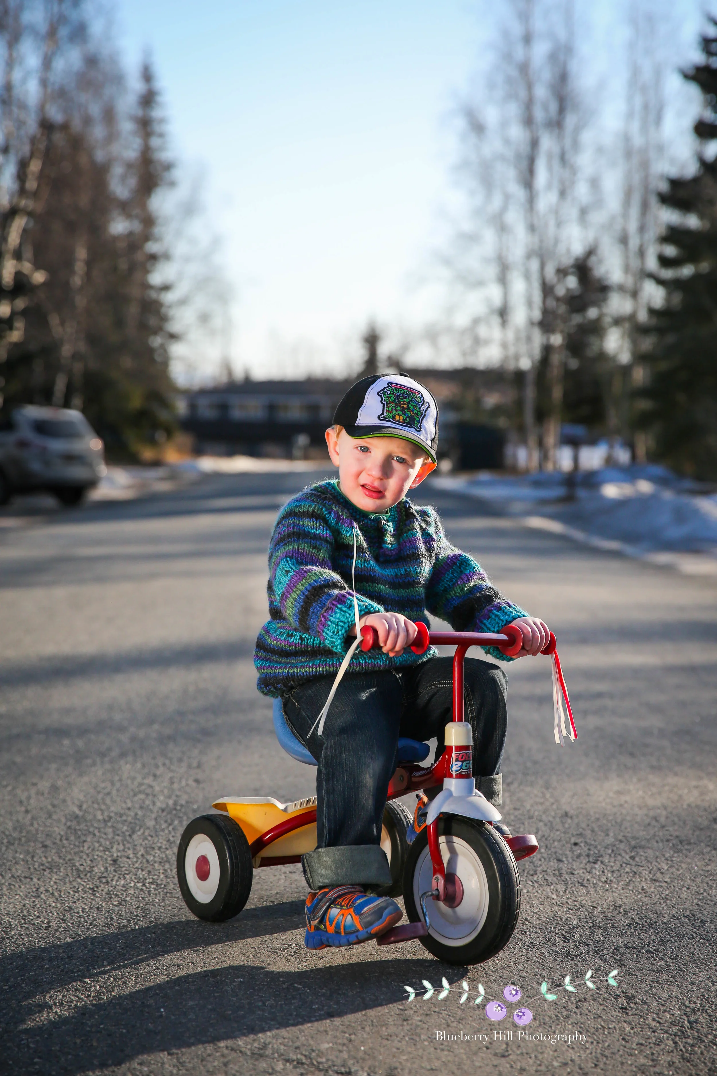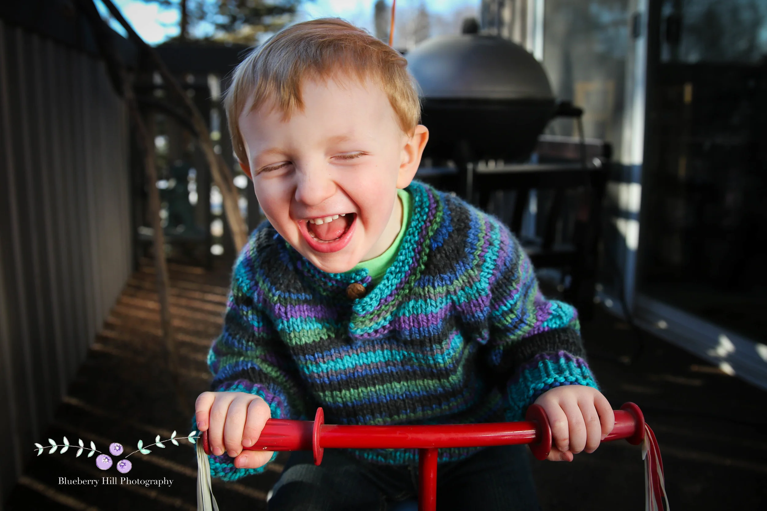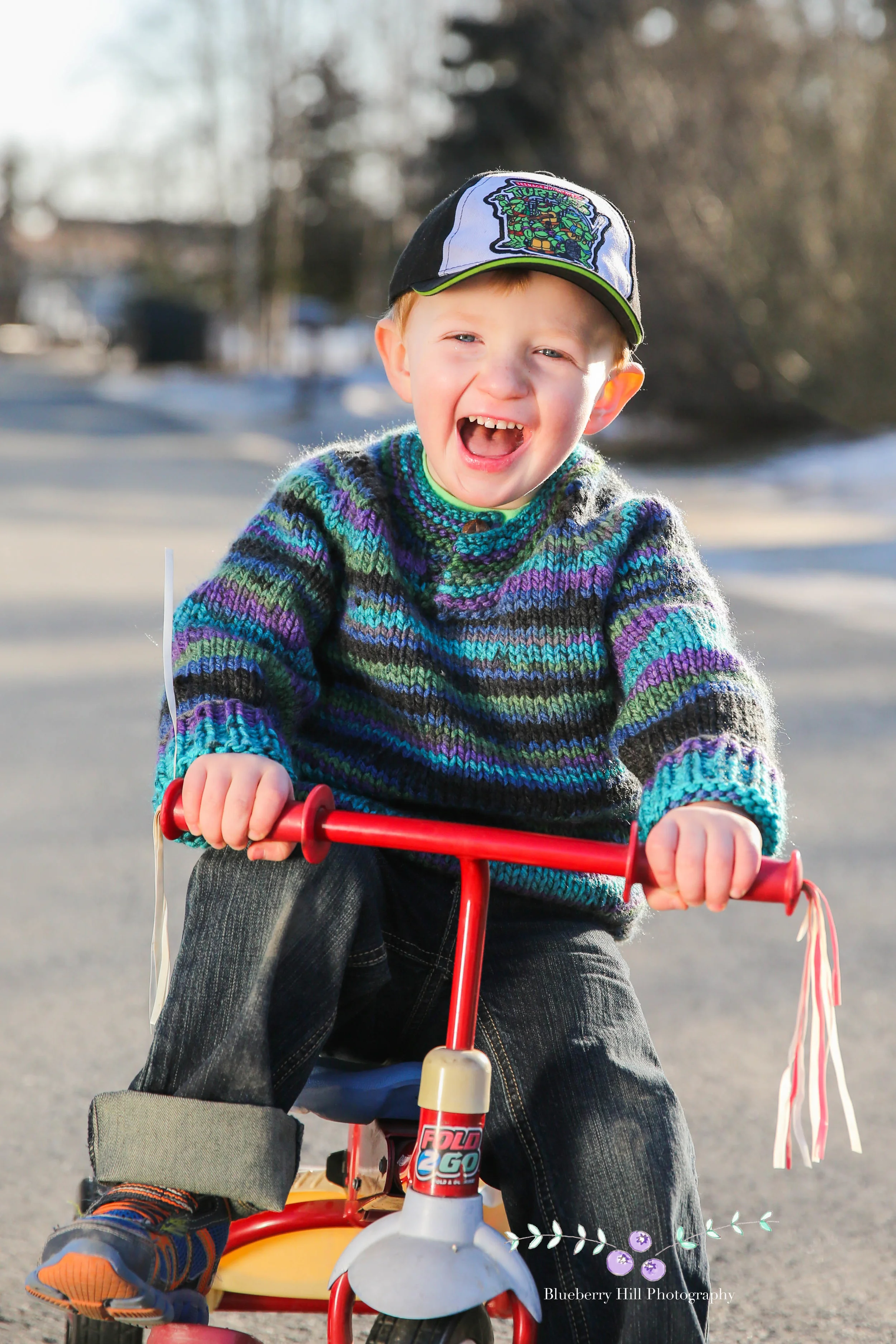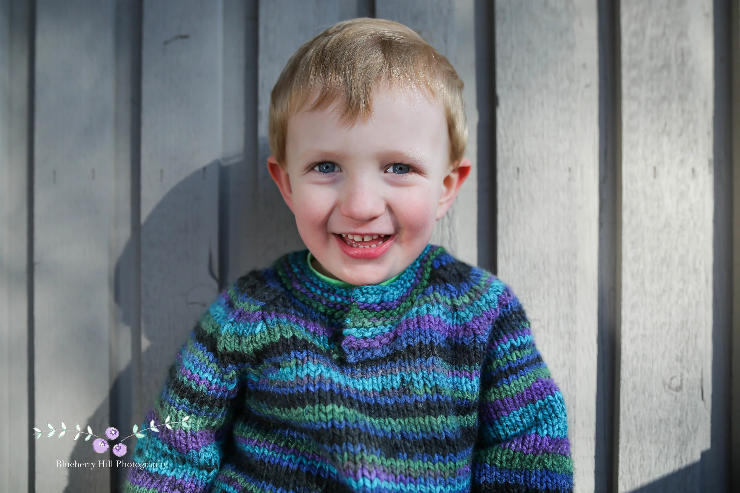 The amazing sweater he's wearing was made by his Grandma, with yarn Jesse picked out himself-- I'm guessing because it's got some Ninja Turtle colors in there, including his favorite: Donatello. Jesse's Grandma lives in Minnesota, so doesn't get to see him often-- which was the inspiration for the photo shoot.