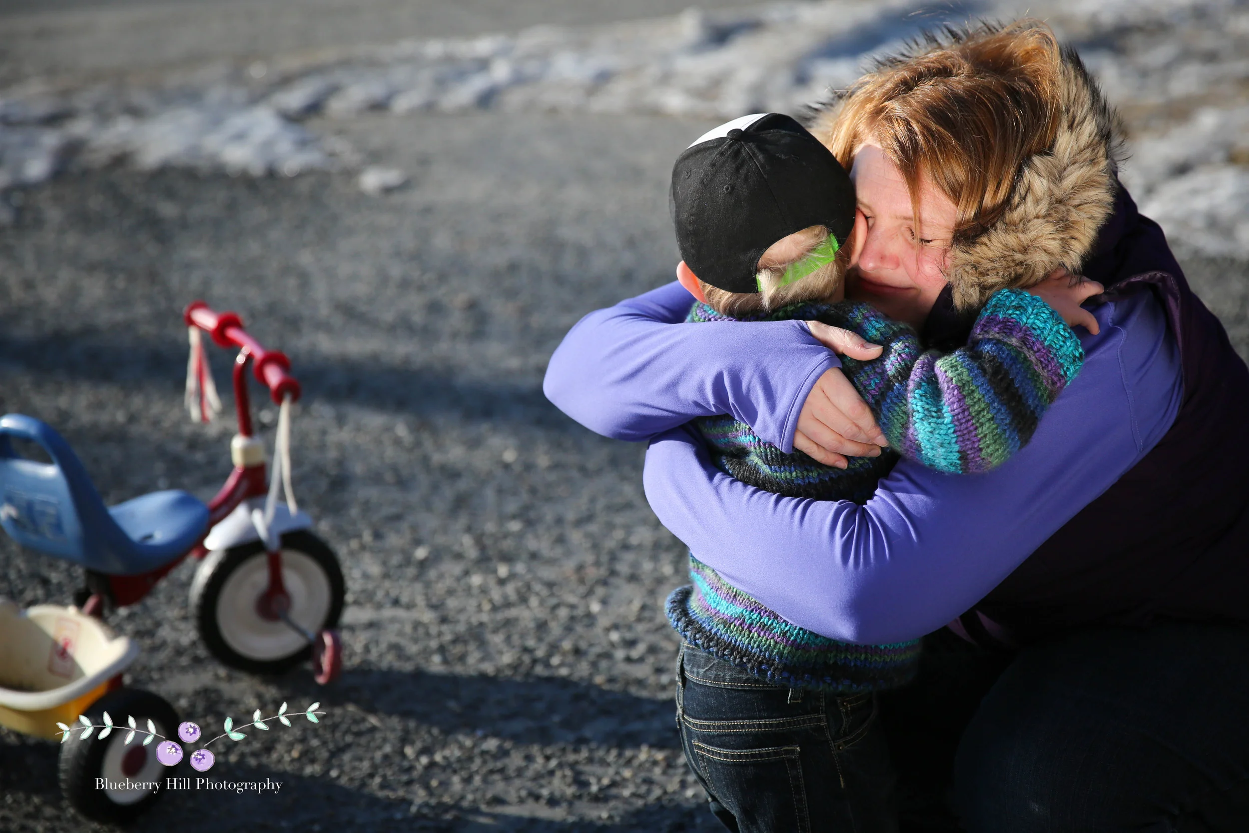 During our shoot, Jesse fell on the gravel and began to cry. I felt a little guilty taking photos during his meltdown, but at the same time, it was so sweet. A routine the two of them have done probably hundreds of times: Jesse takes a spill and starts crying, immediately runs to Maggie. She makes everything all better with a tight hug and a kiss. I love that you can see the tricycle in the background of this photo and that the light was hitting her face.