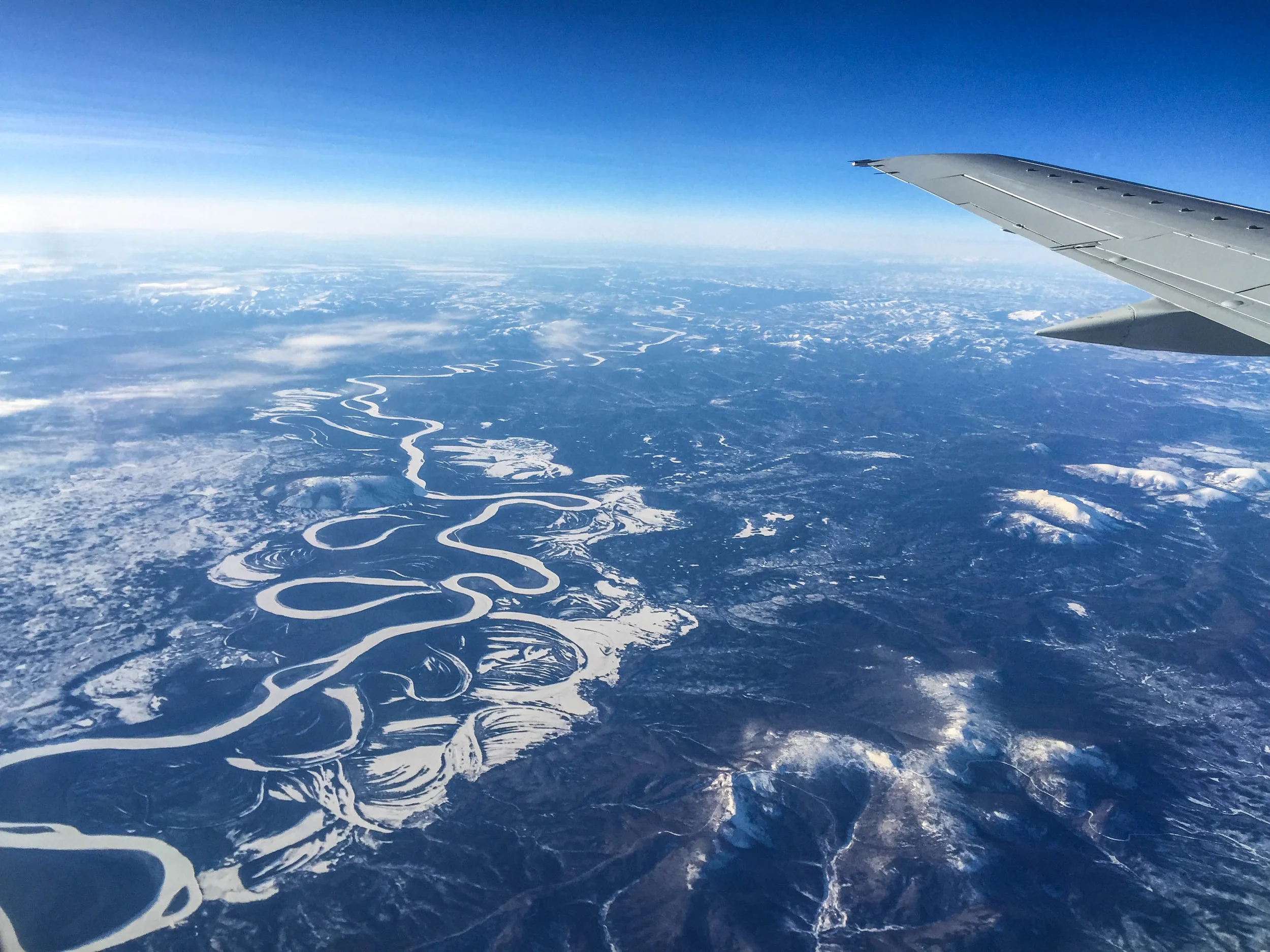 She hands her a bag of pretzels and moves on, while I continue staring at the sparkling ribbons of frozen rivers below, threading across Alaska.
