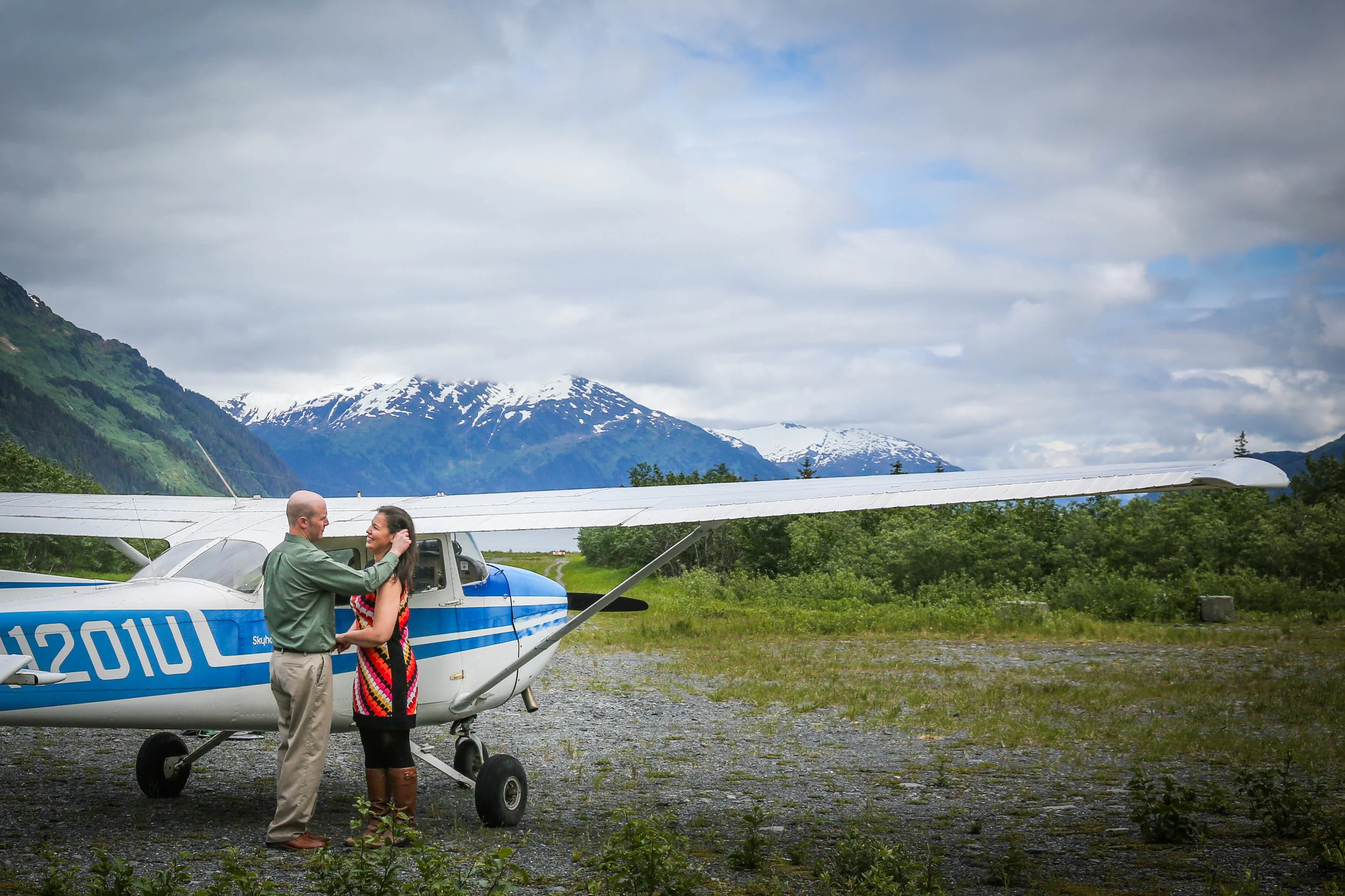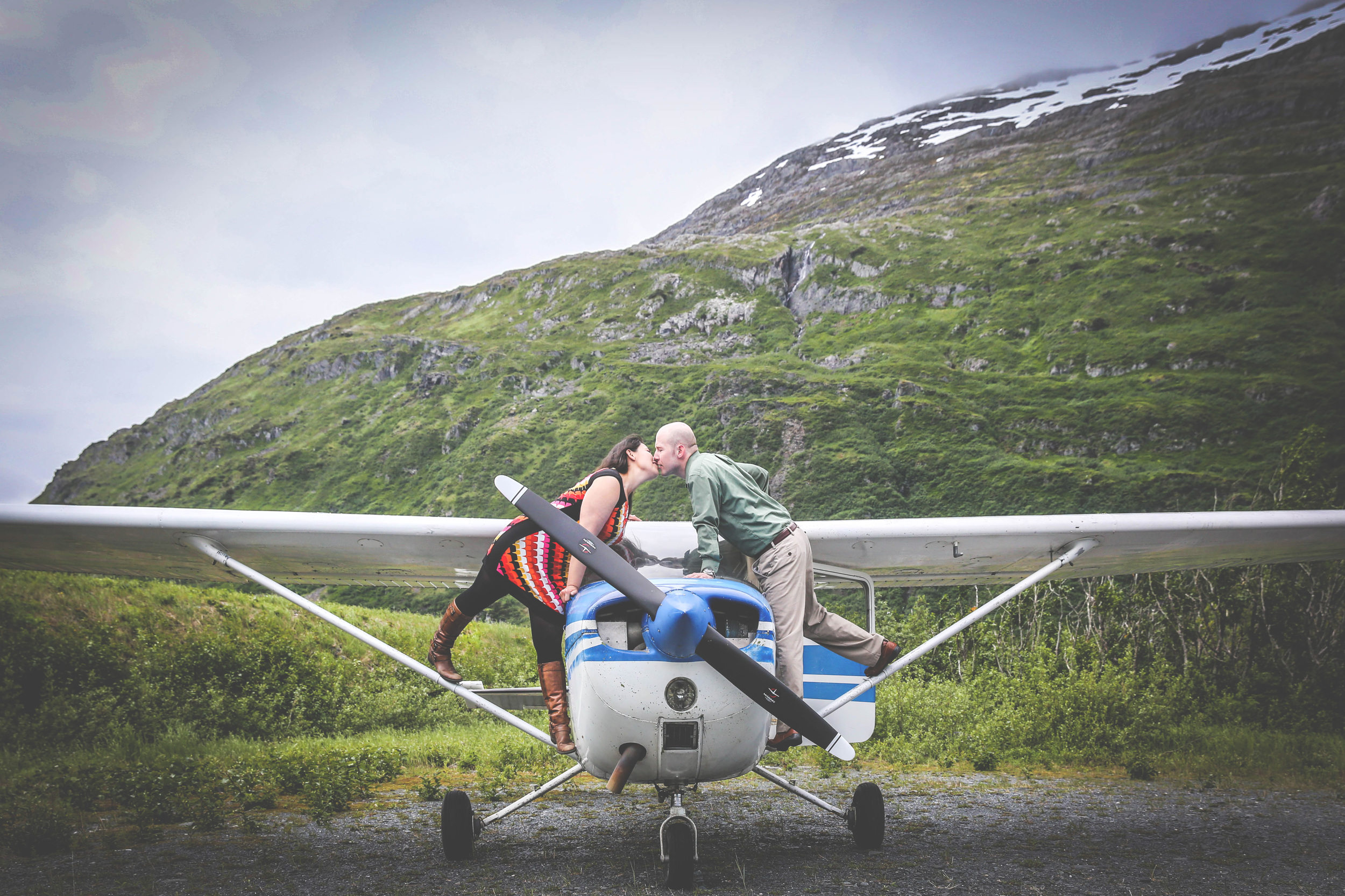 It's not everyday that your office takes flight! Samantha & Owen's engagement has to be one of the most amazing photography experiences I've ever had. The couple shares a love for aviation and our original plan was to take photos by their plane on Lake Hood. The day before the shoot, I got a text from Sam asking if I'd be willing to go for a plane ride for their Engagement Session. Of course I would! Have I mentioned I love Alaskan couples!?