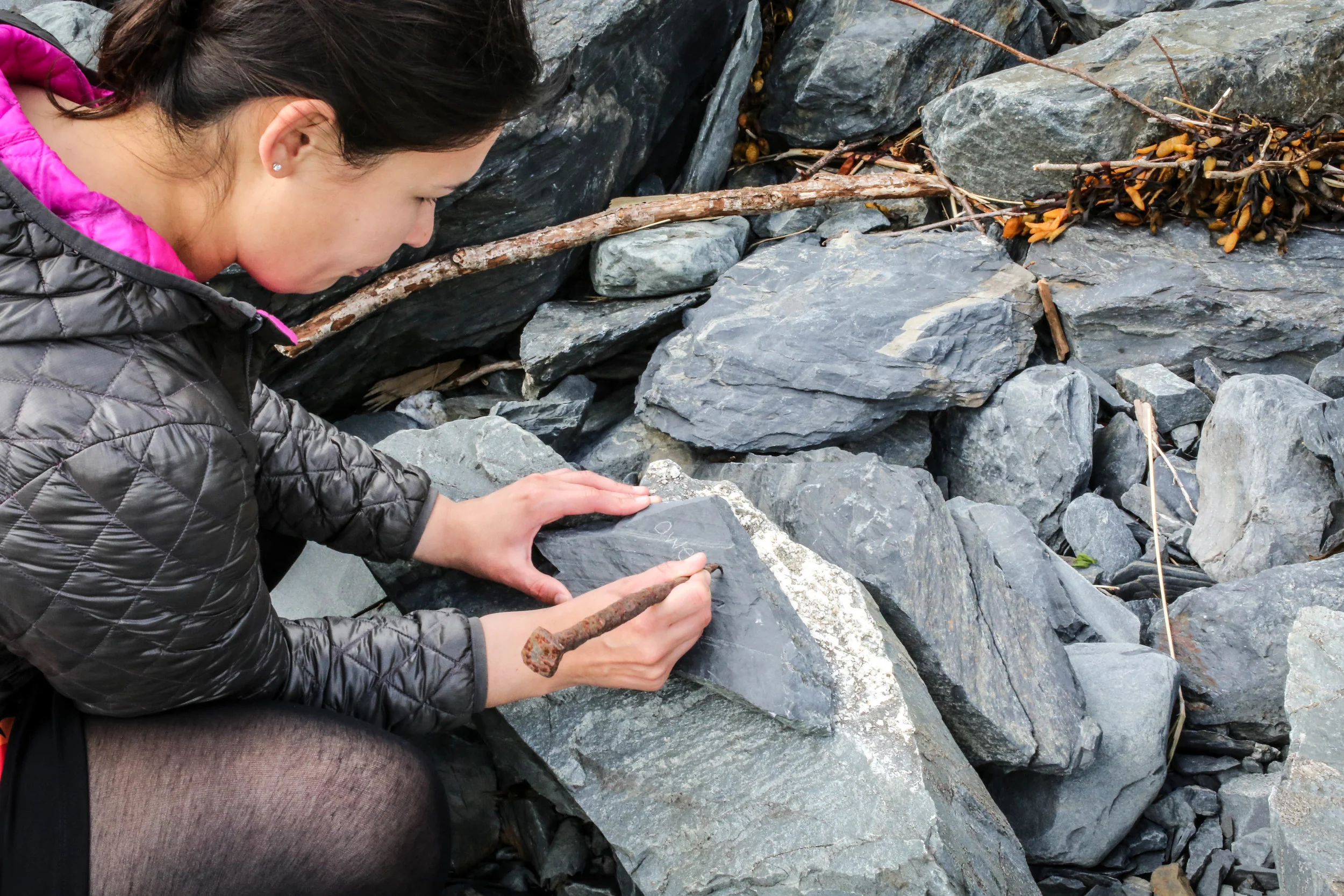 Samantha found an old rusty rail road spike and a cool rock on the beach.