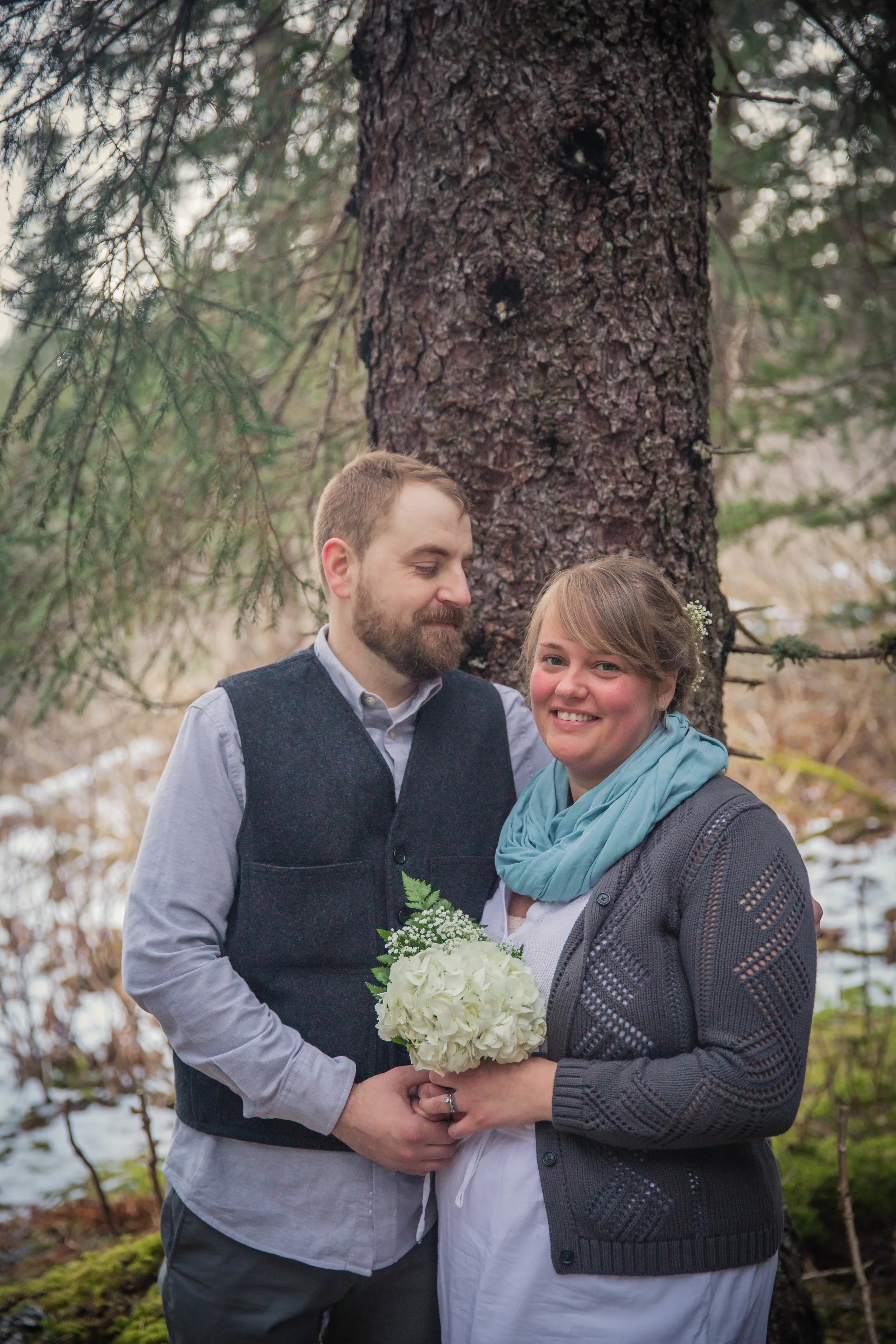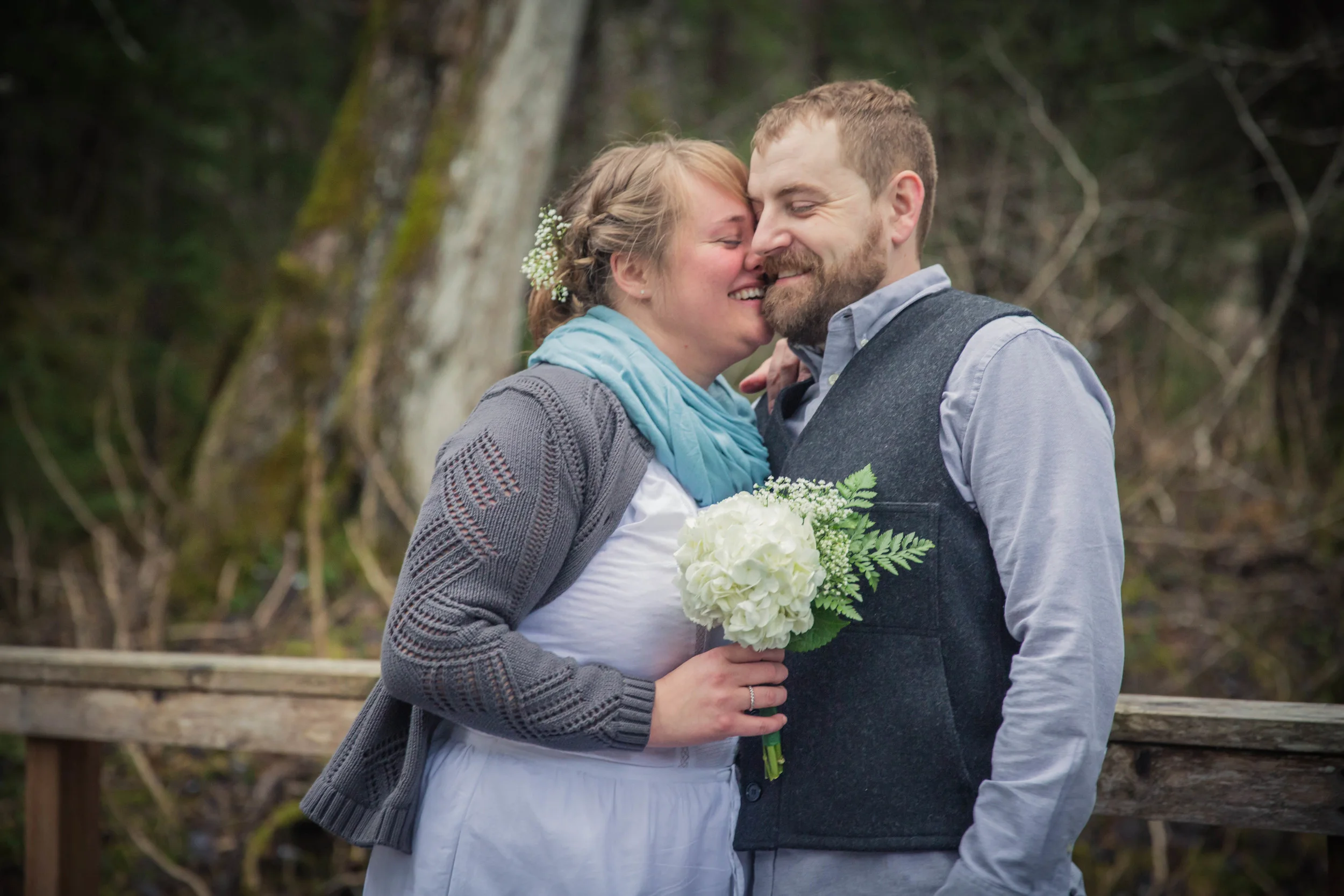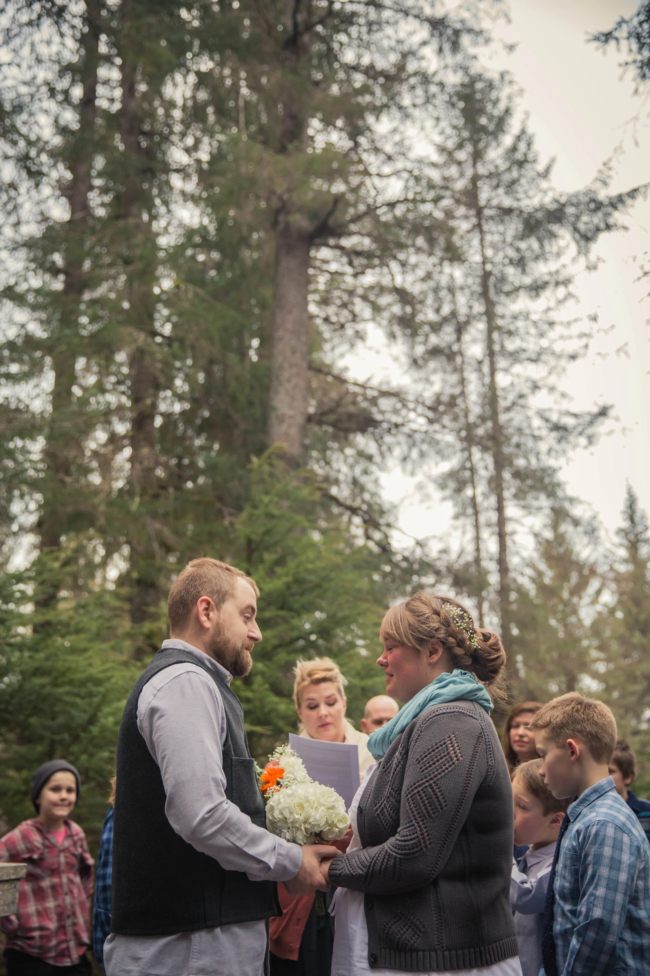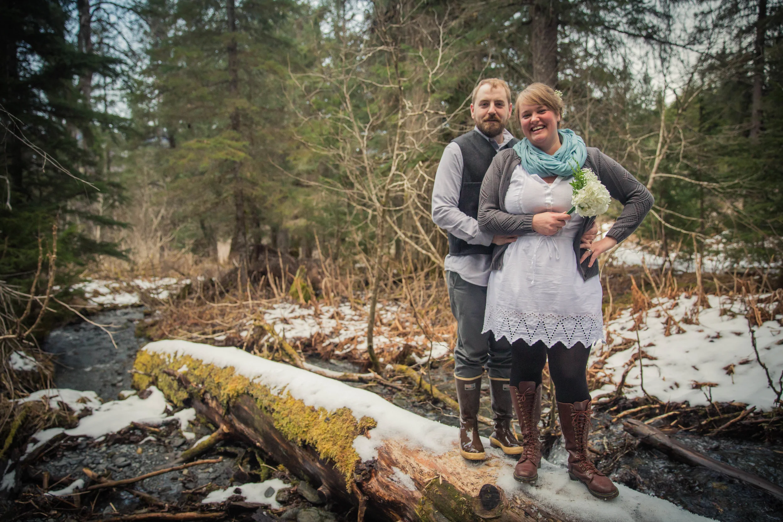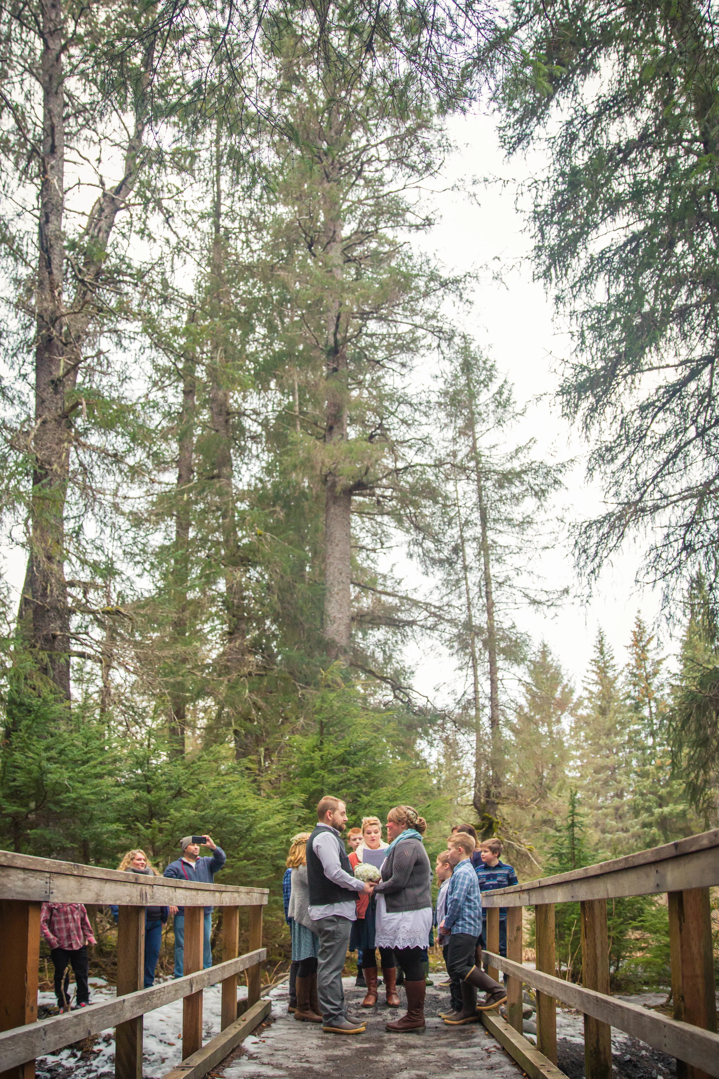 But this is what I loved about Kerry & Patrick’s wedding! There were a few moments of “what are we going to do?” looks exchanged, but then the problem solving started. Everyone was dressed for an outdoor Alaskan wedding, so we made use of the stunning Winner Creek Trail nearby. It was a short walk into the woods before we came to a bridge over a little creek, and everyone realized this was more perfect for the beginning of Kerry & Patrick’s marriage than the original plan.