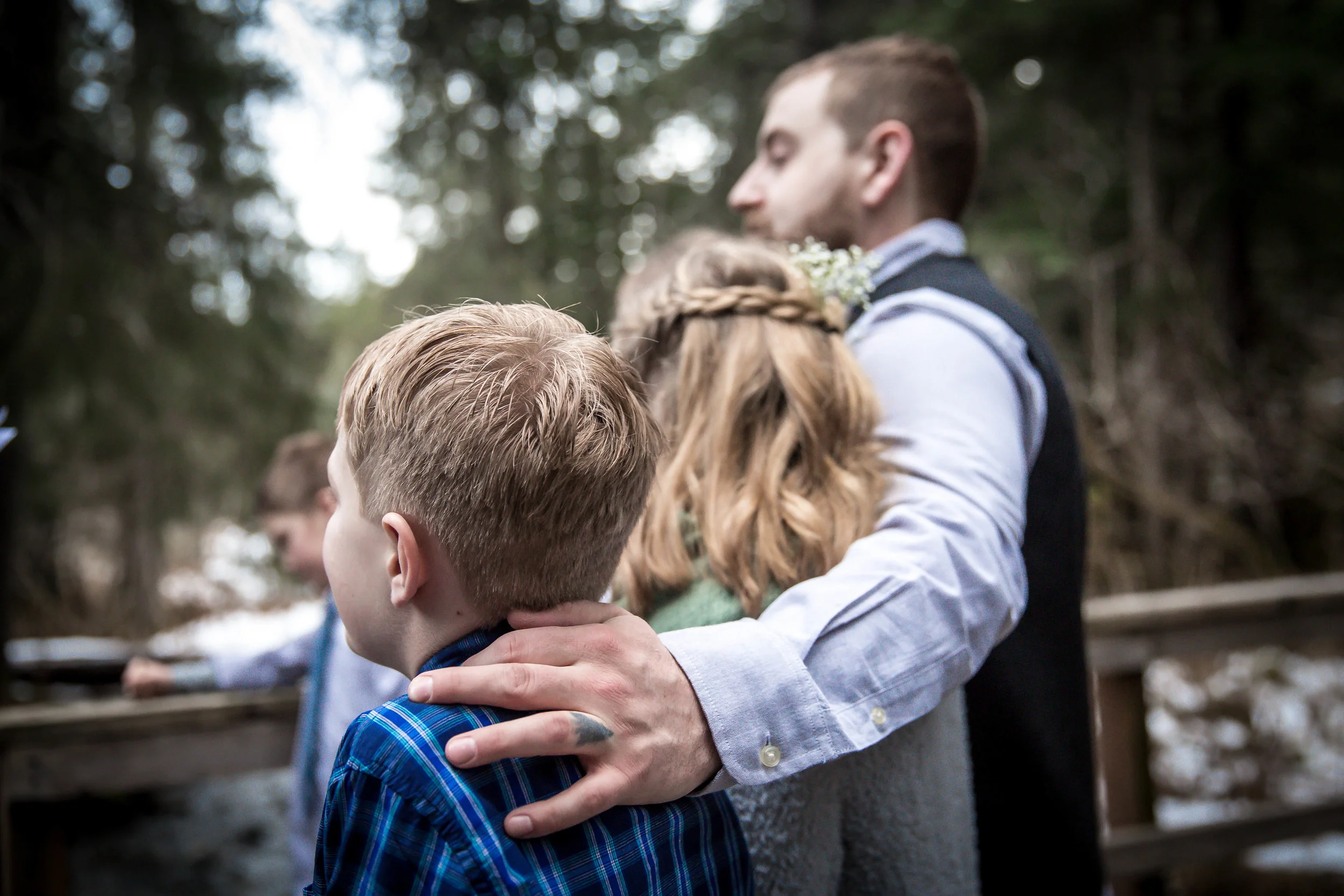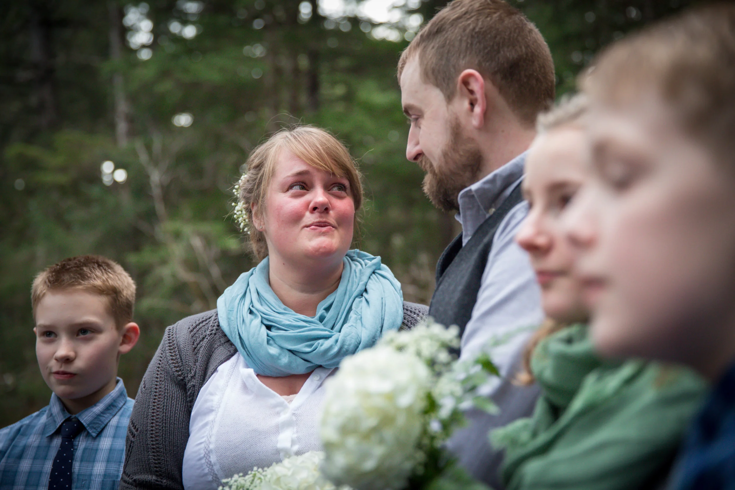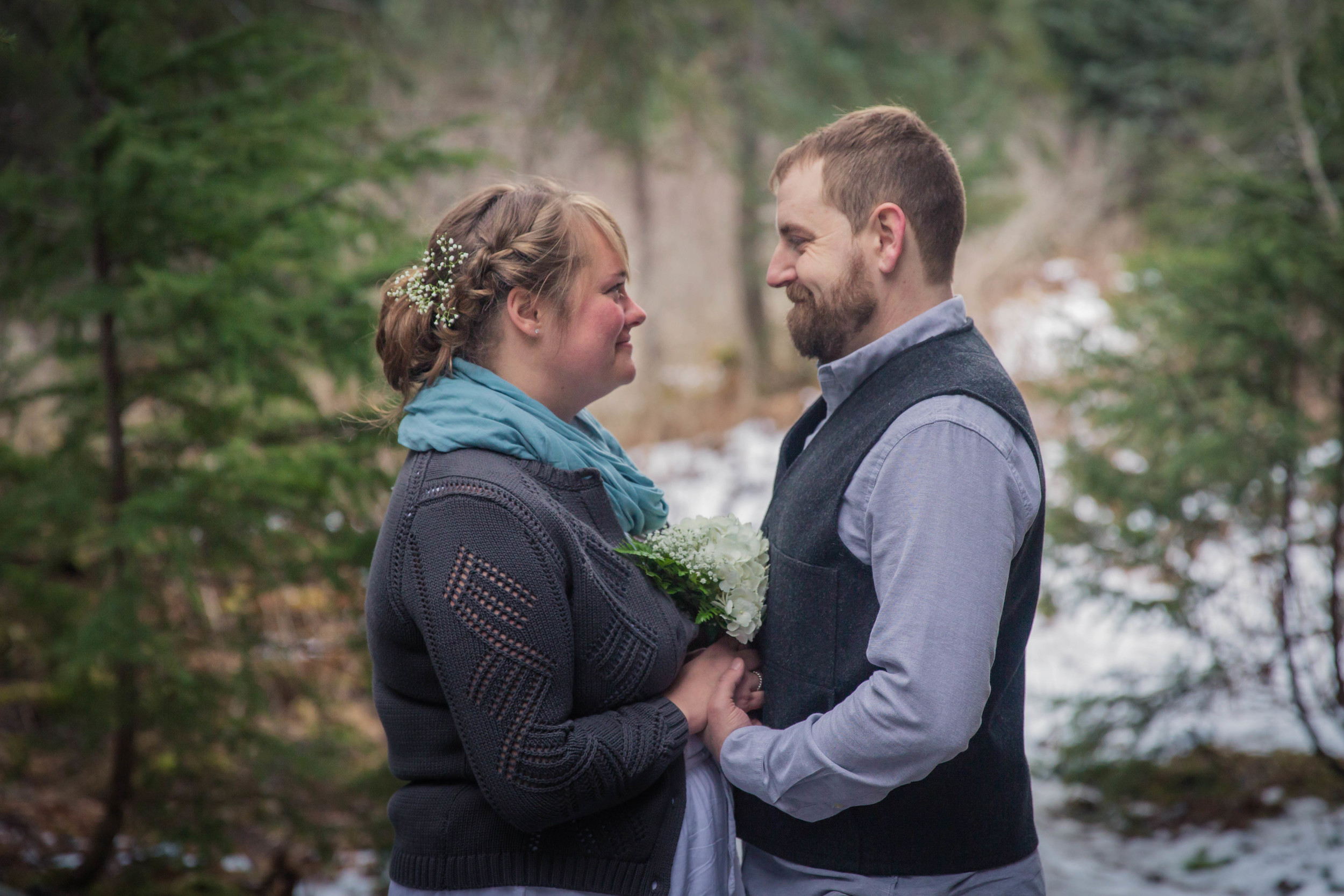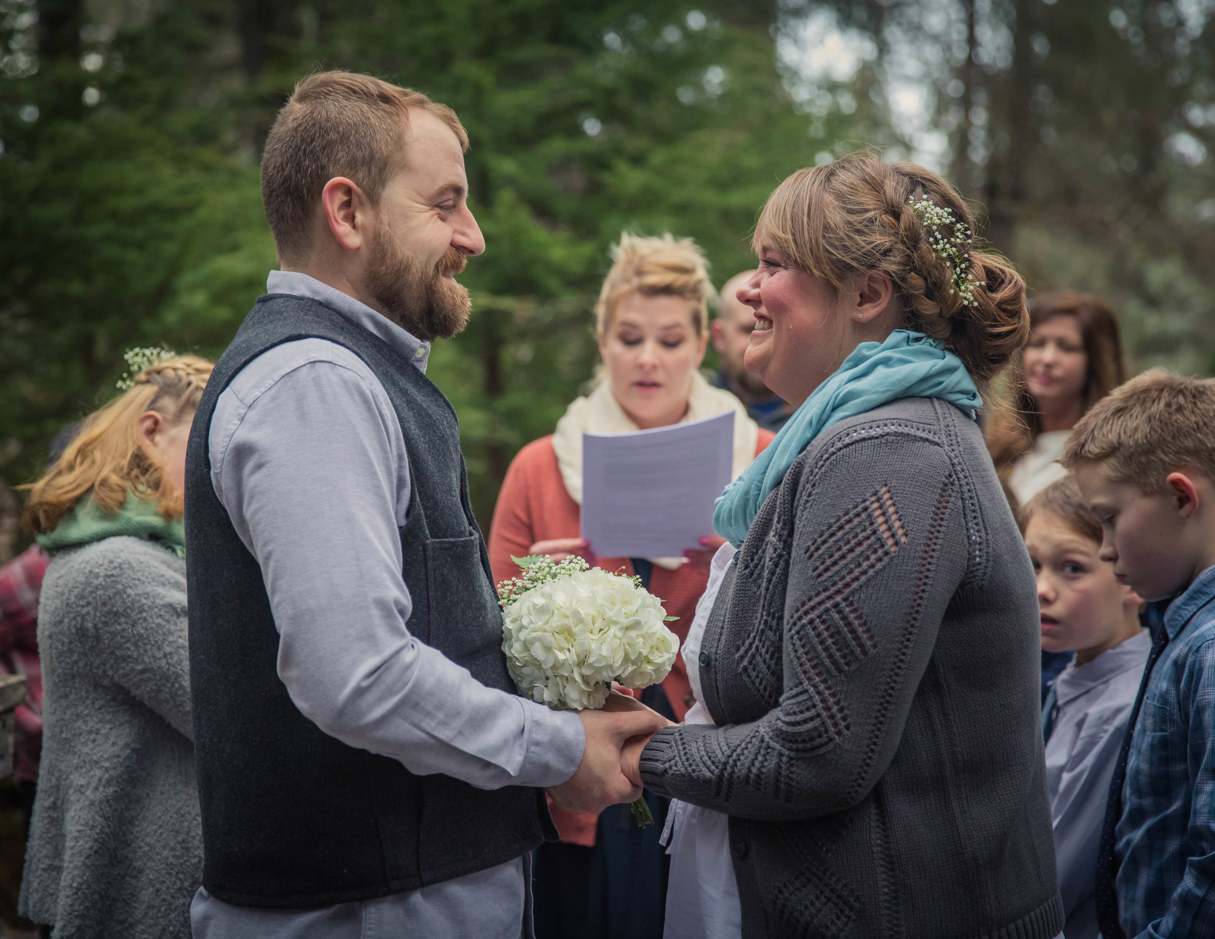But this is what I loved about Kerry & Patrick’s wedding! There were a few moments of “what are we going to do?” looks exchanged, but then the problem solving started. Everyone was dressed for an outdoor Alaskan wedding, so we made use of the stunning Winner Creek Trail nearby. It was a short walk into the woods before we came to a bridge over a little creek, and everyone realized this was more perfect for the beginning of Kerry & Patrick’s marriage than the original plan.