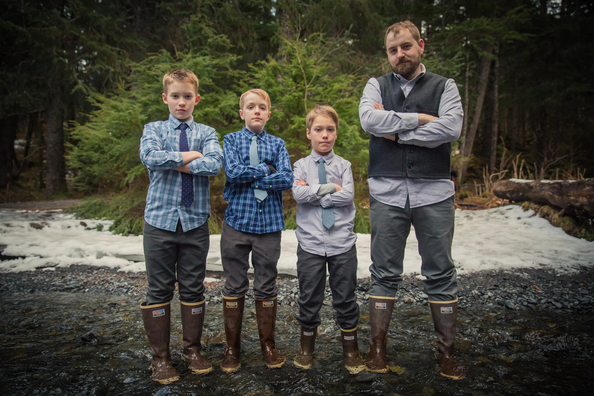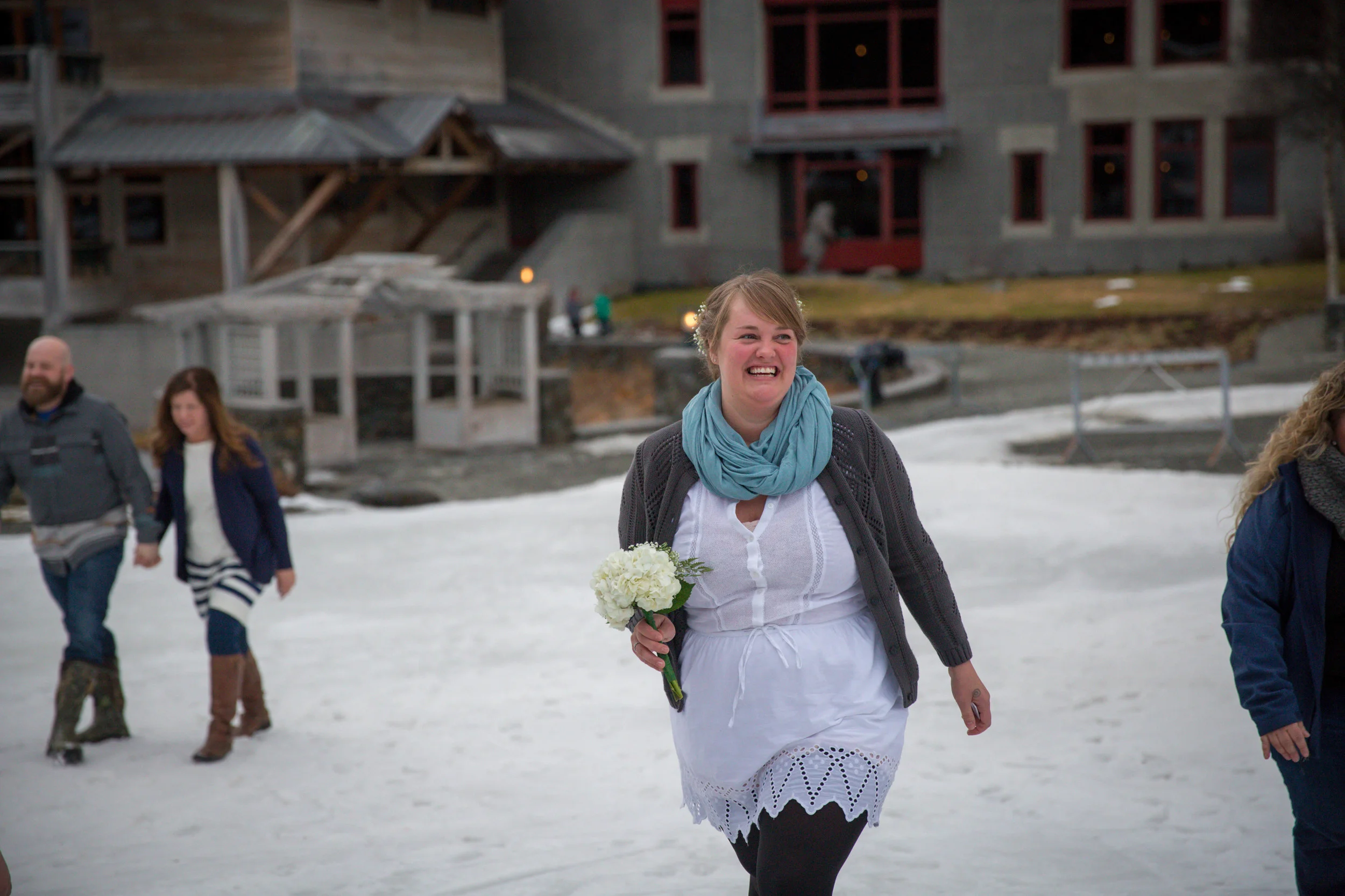 Kerry & Patrick planned a beautiful, low-key Alaskan wedding surrounded by their children and friends. Kerry told me they only planned it a few weeks in advance, because that’s another thing wedding magazines don’t tell you: life happens all around you when you’re supposed to be planning some grandiose affair. We were to meet at the bottom of the Alyeska Tram at 6 o’clock on a lovely warm March evening. We had scores of Tram Tickets and the kids had their Xtra-Tufs. What more could anyone want for an Alaskan wedding?